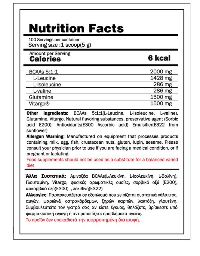 Δοσολογία: Για καλύτερα αποτελέσματα, καταναλώστε 1 δόση 5γρ. (=1 κουτάλι του γλυκού) 20 λεπτά πριν την προπόνηση και 1 δόση μετά την προπόνηση.