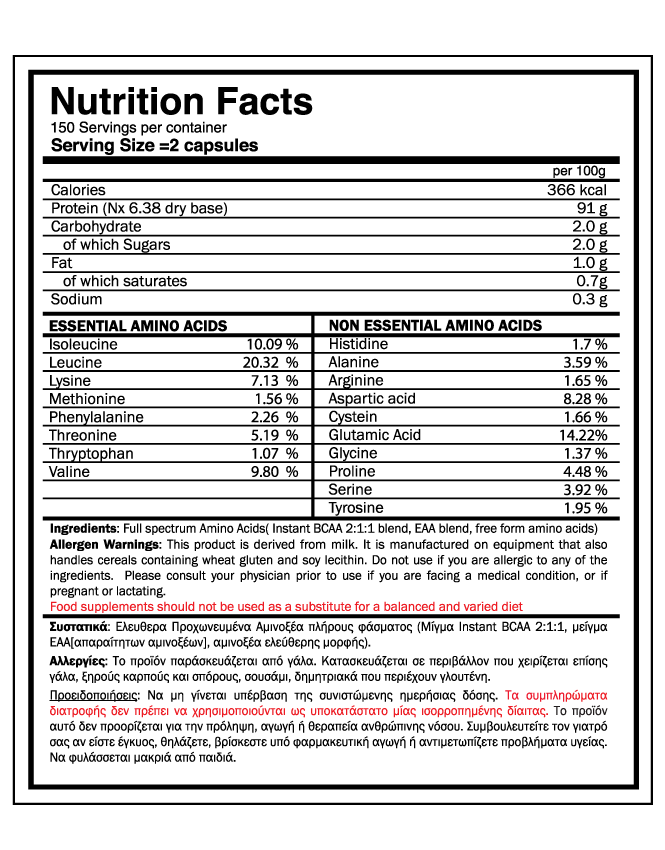 - 1 μερίδα (2 χάπια full spectrum AMINO) αμέσως μετά την προπόνηση για να μεγιστοποιήσετε την αποκατάσταση