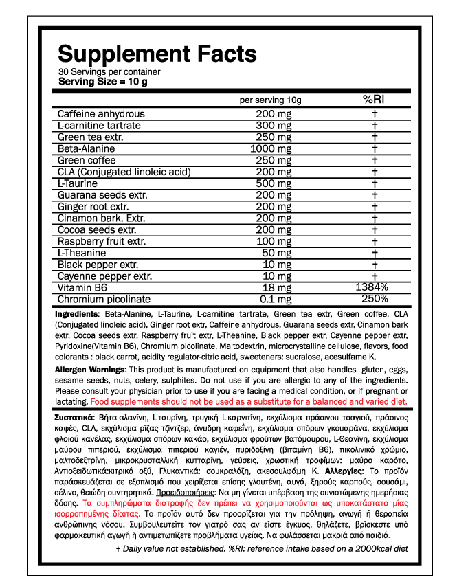 - Άνυδρη καφεΐνη: Η καφεΐνη είναι ένα πολύ διαδεδομένο συστατικό που αυξάνει τα επίπεδα ενέργειας και βελτιώνει τον μεταβολισμο, βοηθώντας με τον τρόπο αυτό στην απώλεια βάρους.