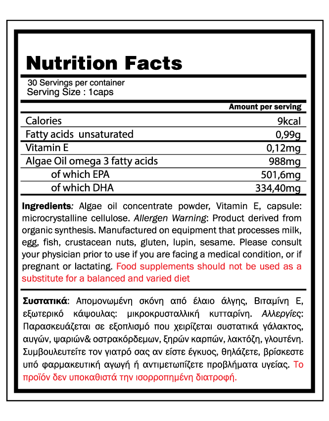 Το Omega 3 της Gold Touch nutrition προέρχεται από την άλγη σε αντίθεση με πολλά άλλα συμπληρώματα διατροφής, τα οποία έχουν ως βάση το ιχθυέλαιο. Αυτό της δίνει ένα συγκριτικό πλεονέκτημα καθώς εξασφαλίζει ότι δεν περιέχονται βαρέα μέταλλα και άλλες τοξίνες οι οποίες τα τελευταία χρόνια λόγω της ρύπανσης των θαλασσών, συσσωρεύονται στα ψάρια. Επίσης οι κάψουλες είναι άοσμες και δεν αφήνουν επίγευση.