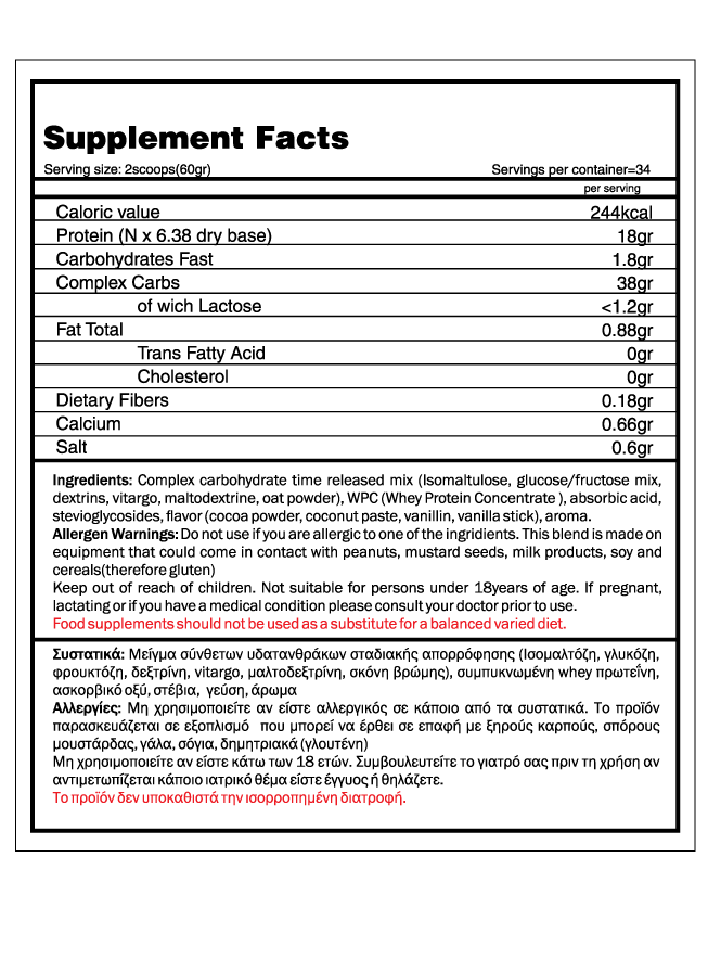 Δηλαδή αποτελείτε από ένα σύμπλεγαμα σύνθετων υδατνθράκων που απορροφώνται με διαφορετικούς ρυθμούς με αποτέλεσμα να απελευθερώνουν σταδιακά την ενέργεια που χρειάζεται το σώμα σας για να τροφοδοτήσει τις προπονήσεις σας, ενώ επίσης αναπληρώνει τα αποθέματα γλυκογόνου. Επιπλέον εξασφαλίζεται η διατήρηση της ινσουλίνης σε υψηλό επίπεδο, ενισχύοντας έτσι την αναβολική της δράση καθως και πρωτείνη υψηλής διατροφικής αξίας και με λιγότερη ζάχαρη χοληστερίνη και σχεδόν μηδενικά κορεσμένα λιπαρά .